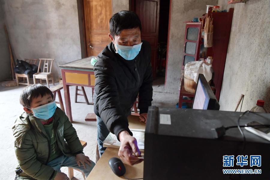 在江西省萬(wàn)載縣高村鎮(zhèn)新竹村尹家?guī)X村組,新竹小學(xué)的校長(zhǎng)羅長(zhǎng)石在學(xué)生郭仕錢(qián)家中,為他拷貝當(dāng)天的課程(2月17日攝)。新華社記者 彭昭之 攝