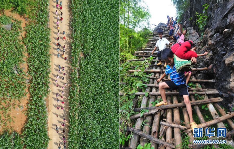 這是一張拼版照片。左圖:在大化瑤族自治縣板升鄉(xiāng)弄勇村,孩子們走在放學(xué)路上(2019年5月10日攝,無(wú)人機(jī)照片);右圖:在弄勇村弄頂屯,孩子們扛著生活用具,爬懸梯上學(xué)(2012年9月3日攝)。目前,弄勇村所有的屯都已告別沒有公路的歷史。新華社記者 黃孝邦 攝