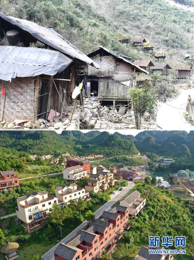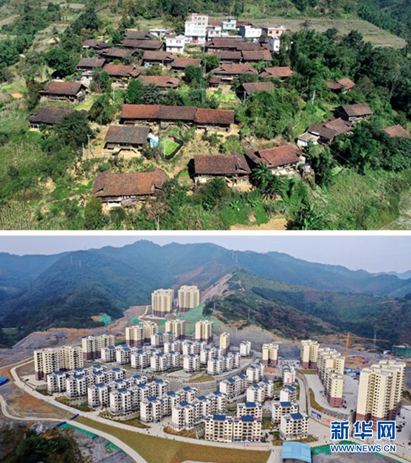 這是一張拼版照片。上圖:廣西百色市隆林各族自治縣金鐘山鄉(xiāng)平流村坡安屯群眾搬遷前的住房(2017年7月21日攝,無(wú)人機(jī)照片);下圖:平流村坡安屯群眾搬遷到安置點(diǎn)的新住房(2019年12月3日攝)。新華社記者 張愛林 攝