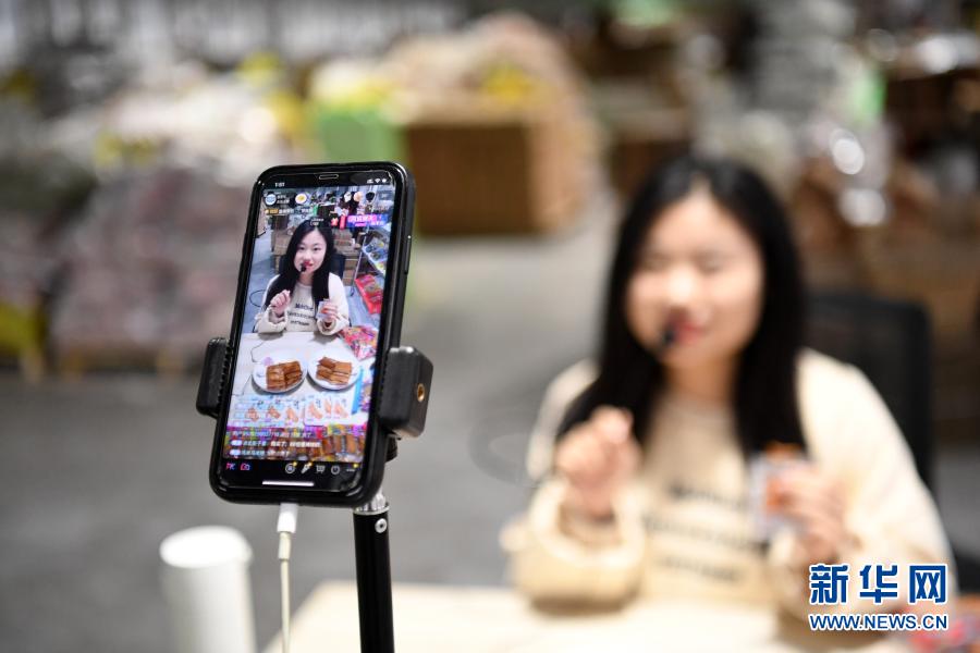 網絡主播在梁平一家工廠內直播推銷傳統豆干(11月18日攝)。新華社記者 唐奕 攝