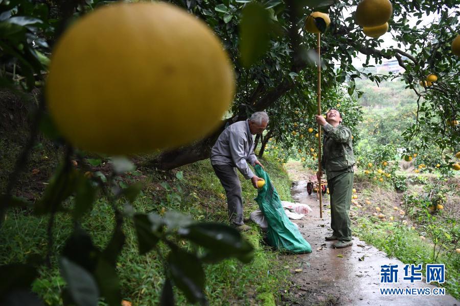 在梁平合興街道龍灘村,農戶在柚園內采摘柚子(11月18日攝)。新華社記者 唐奕 攝