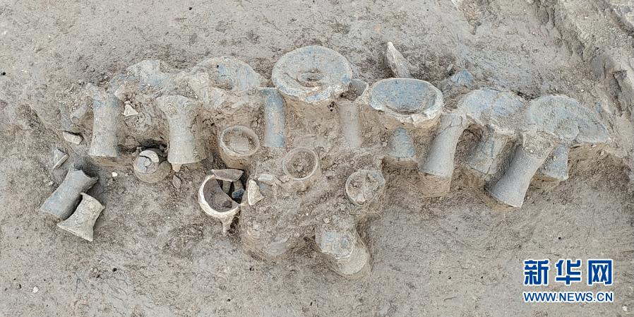 圖為河南葉縣余莊遺址標號為M10的墓葬出土的隨葬陶器。該組陶器擺放有序、器類成組,呈現出鮮明的禮制色彩(11月3日攝)。新華社發(河南省文物考古研究院供圖)