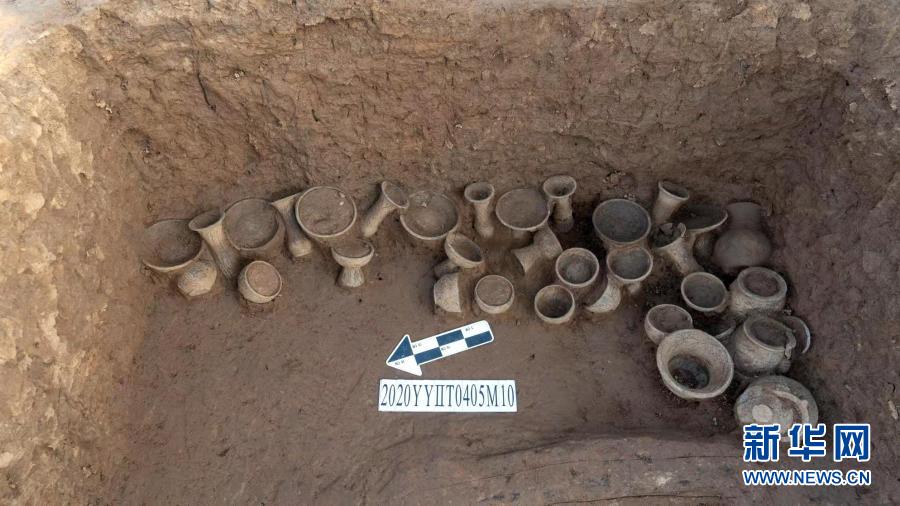 圖為河南葉縣余莊遺址標號為T0405的探方出土的陶器,該組陶器擺放有序,呈現出鮮明的禮制色彩(11月3日攝)。新華社發(河南省文物考古研究院供圖)