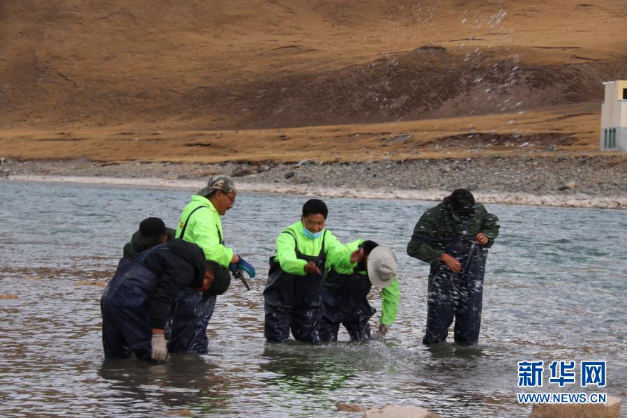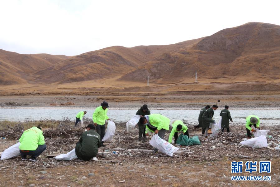 三江源國家公園治多生態(tài)環(huán)保協(xié)會的志愿者在清理河道內(nèi)的垃圾(7月11日攝)。新華社發(fā)