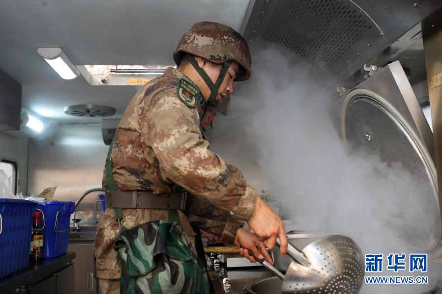 飲食保障隊參賽隊員在野戰炊事車內加工制作野戰快餐(11月29日攝)。新華社發(呂冀周 攝)