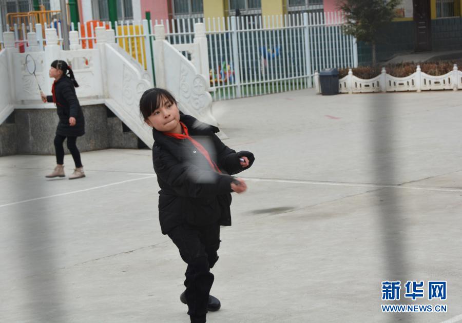 12月1日,在廣河縣三甲集鎮火炬小學的操場上,馬梅在課間和同學打羽毛球。新華社記者顏之宏攝
