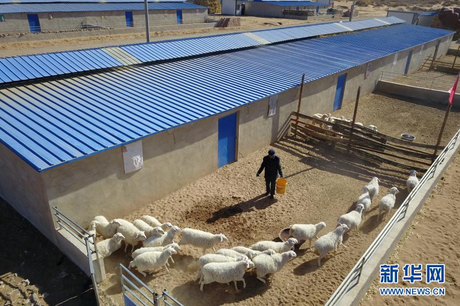 在古浪縣黃花灘生態移民區富民新村養殖小區,村民李應川給羊喂水(3月10日攝,無人機照片)。新華社記者 范培珅 攝