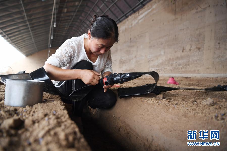 在臨夏回族自治州臨夏縣先鋒鄉前韓村,易地扶貧搬遷戶朱懷蘭在日光溫室內勞作(8月11日攝)。新華社記者 陳斌 攝