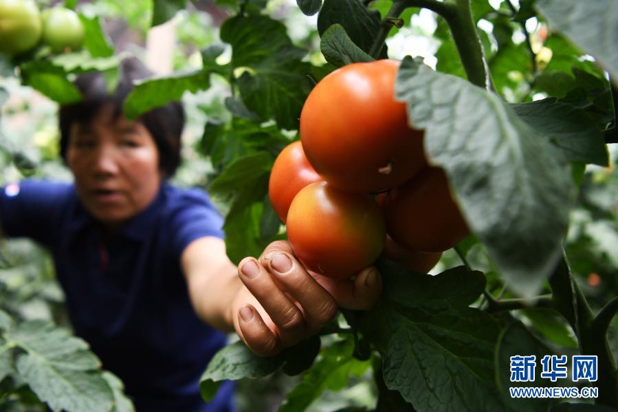 在臨夏回族自治州臨夏縣先鋒鄉前韓村,易地扶貧搬遷戶韓貴蘭在日光溫室內采摘西紅柿(8月11日攝)。新華社記者 陳斌 攝