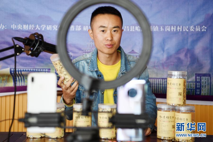 在宕昌縣哈達鋪鎮藥鄉農民專業合作社聯合社,工作人員網絡直播賣藥材(9月18日攝)。新華社記者 范培珅 攝