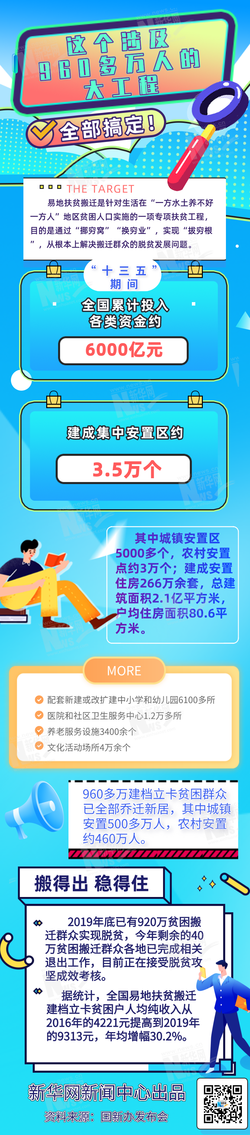 趙辰昕表示,2019年底已有920萬貧困搬遷群眾實現脫貧,今年剩余的40萬貧困搬遷群眾各地已完成相關退出工作,目前正在接受脫貧攻堅成效考核。貧困群眾易地搬遷后就業能力明顯提升,有勞動力的搬遷家庭實現了至少1人就業目標,搬遷群眾收入水平得到顯著提升。