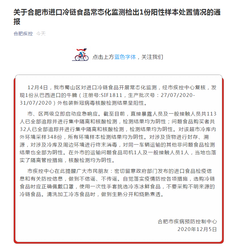 12月4日,合肥市蜀山區(qū)對(duì)進(jìn)口冷鏈?zhǔn)称烽_展常態(tài)化監(jiān)測(cè),經(jīng)市疾控中心復(fù)核,發(fā)現(xiàn)1份從巴西進(jìn)口的牛腩(注冊(cè)號(hào):SIF1811,生產(chǎn)批次號(hào):27/07/2020-31/07/2020)外包裝新冠病毒核酸檢測(cè)結(jié)果呈陽(yáng)性。