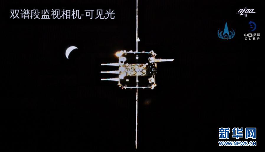 這是嫦娥五號(hào)軌道器返回器組合體逐漸接近上升器畫面。