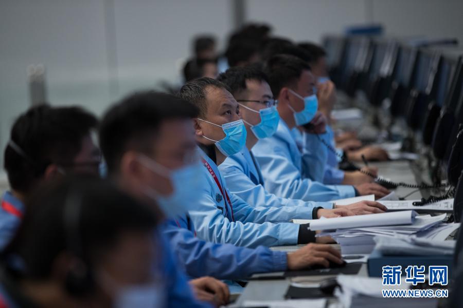 12月6日,航天科技人員在北京航天飛行控制中心指揮大廳監測嫦娥五號上升器與軌道器返回器組合體交會對接情況。