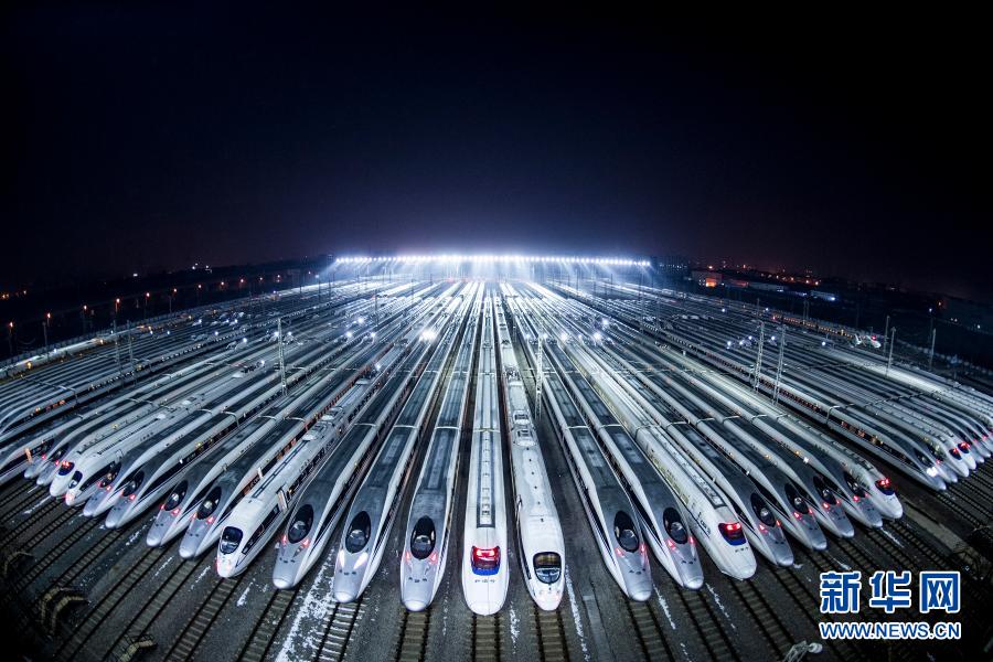 動車組停靠在武漢動車段的存車線上,準備進行檢修和保溫作業(2018年2月1日攝)。新華社記者 肖藝九 攝