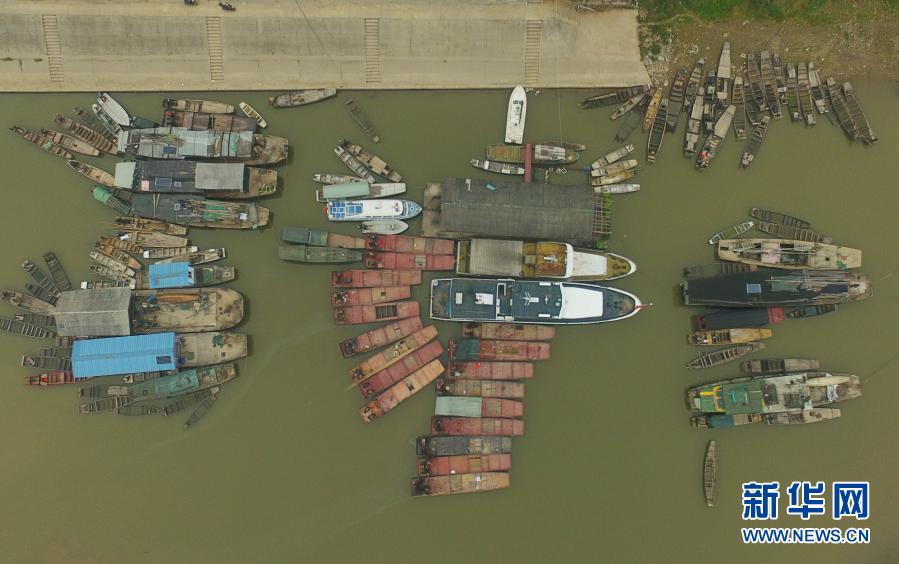 在湖南常德漢壽縣蔣家嘴鎮,待回收的鐵漁船停靠在洞庭湖邊(2019年12月17日攝,無人機照片)。2020年1月1日零時起,長江流域332個自然保護區和水產種質資源保護區全面禁止生產性捕撈。新華社記者 薛宇舸 攝