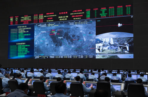 12月6日,航天科技人員在北京航天飛行控制中心指揮大廳監測嫦娥五號上升器與軌道器返回器組合體交會對接情況。新華社記者 金立旺 攝