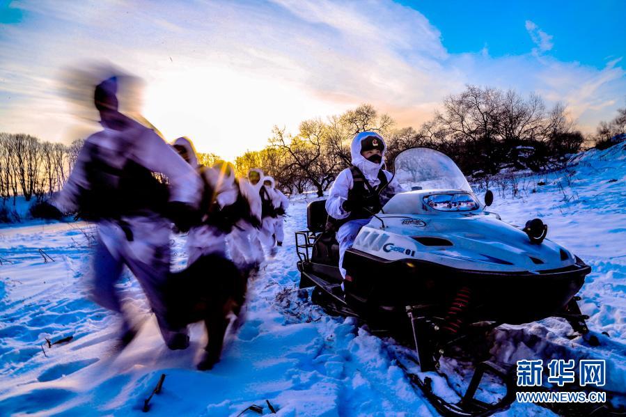 東極哨所官兵組織摩托雪橇和執(zhí)勤分隊(duì)進(jìn)行聯(lián)合戰(zhàn)術(shù)演練(11月4日攝)。新華社發(fā)(李寶成 攝)