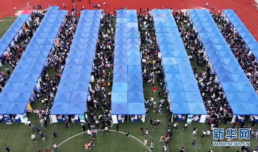 這是10月28日拍攝的上海市2021屆高校畢業生秋季校園招聘會現場(無人機照片)。新華社記者 劉穎 攝