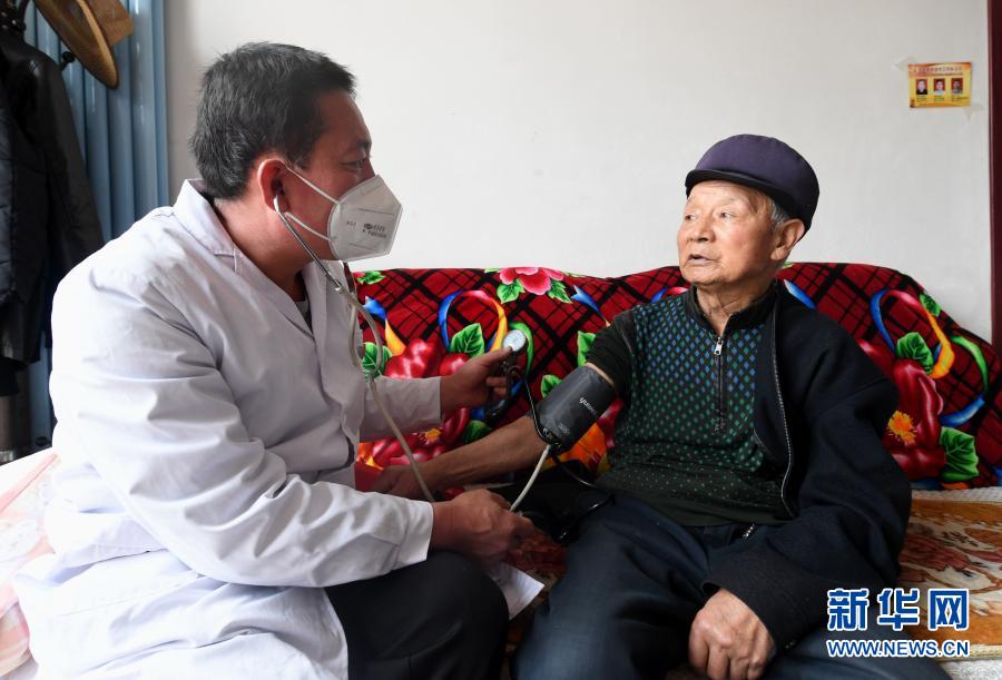 河北阜平縣龍泉關鎮顧家臺村村醫為村民測量血壓(4月15日攝)。新華社記者 王曉 攝