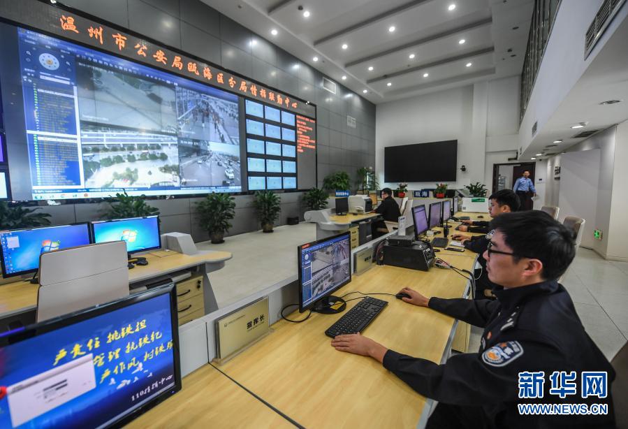 浙江省溫州市甌海區公安分局指揮中心內,警務人員在后臺實時監控各類動態信息(2018年11月14日攝)。該局依托互聯網大數據等新手段,打造管理新模式,全面提升了警務效能。新華社記者 徐昱 攝