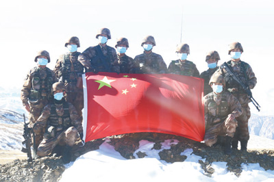 “里孜戍邊模范連”官兵巡邏到達(dá)界碑前,向國(guó)旗宣誓并合影留念。 鄔 軍攝