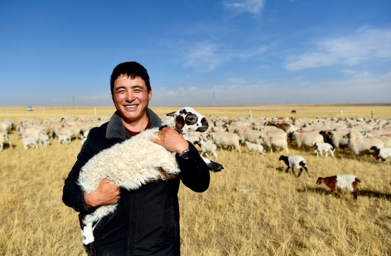青海省剛察縣泉吉鄉(xiāng)寧夏村牧民達(dá)日杰懷抱一只小羊羔(11月12日攝) 張宏祥攝/本刊