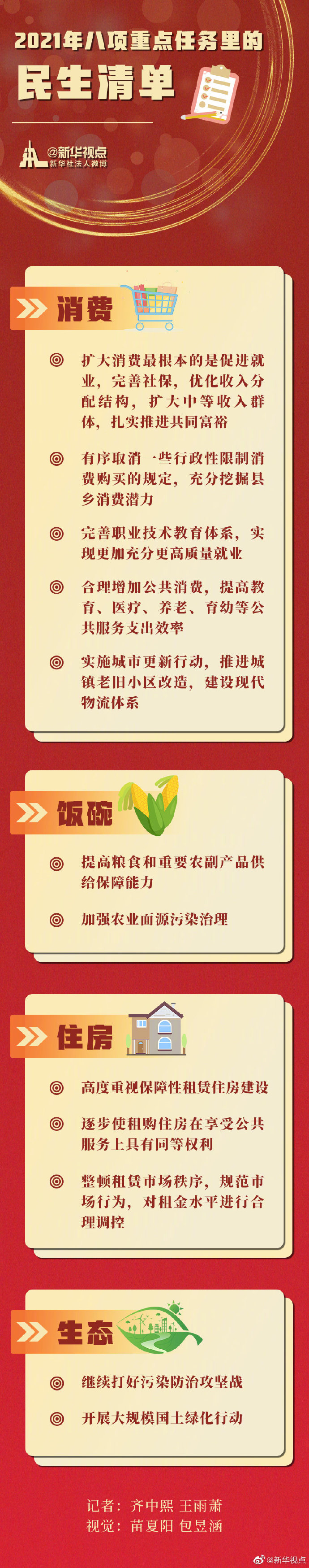 保障和改善民生始終是經濟工作的重點。中央經濟工作會議規劃的2021年八項重點任務中,涉及民生的內容占有相當篇幅。記者從中梳理出這樣一份“民生清單”,件件都與你我相關—— ?????