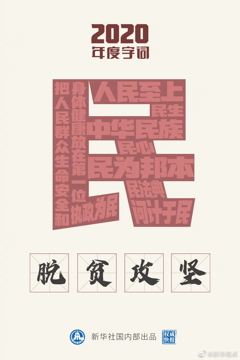 “民”當(dāng)選2020年度“國(guó)內(nèi)字”;“脫貧攻堅(jiān)”當(dāng)選2020年度“國(guó)內(nèi)詞”。國(guó)家語(yǔ)言資源監(jiān)測(cè)與研究中心、商務(wù)印書館等21日發(fā)布“漢語(yǔ)盤點(diǎn)2020”年度字詞,定格我國(guó)年度記憶。這一年,從抗疫抗洪到民法典誕生、謀劃開(kāi)啟“十四五”新征程,處處閃耀“人民至上”理念;這一年,如期完成脫貧攻堅(jiān)目標(biāo)任務(wù),千年夙愿,今朝夢(mèng)圓!?