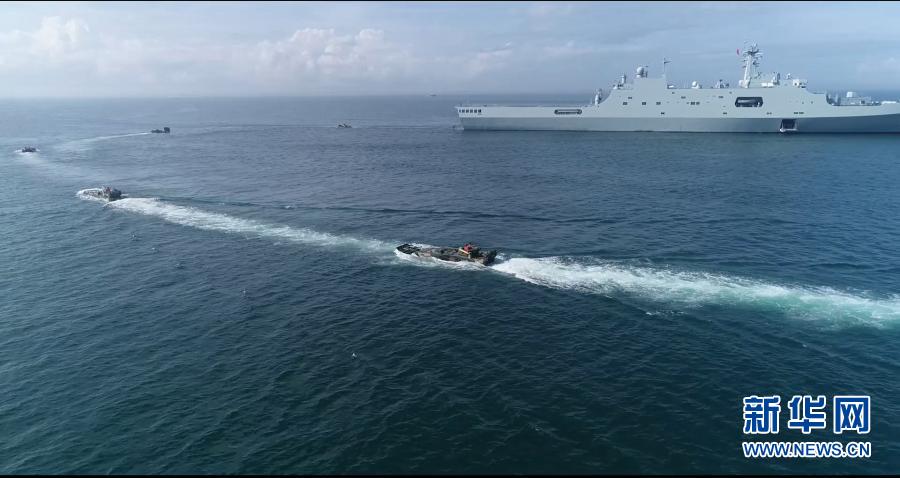 陸軍第72集團軍某旅組織海上駕駛訓練,戰車按協同隊形依次駛上海軍登陸艦(2018年8月16日攝,無人機照片)。新華社發(莊林毅 攝)