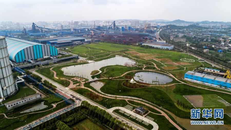 這是3月26日在鄂鋼廠區拍攝的兼具廢水凈化功能的廠區花溪濕地公園。新華社發(桂多 攝)