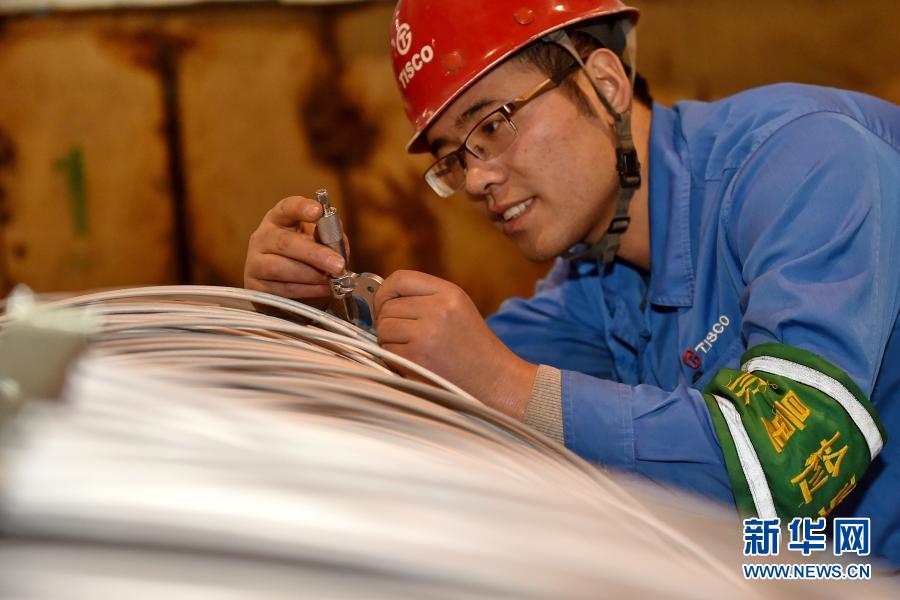 太鋼集團的質檢人員在檢驗“筆尖鋼”鋼絲的質量(2017年1月10日攝)。新華社記者 曹陽 攝