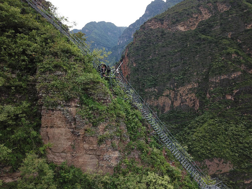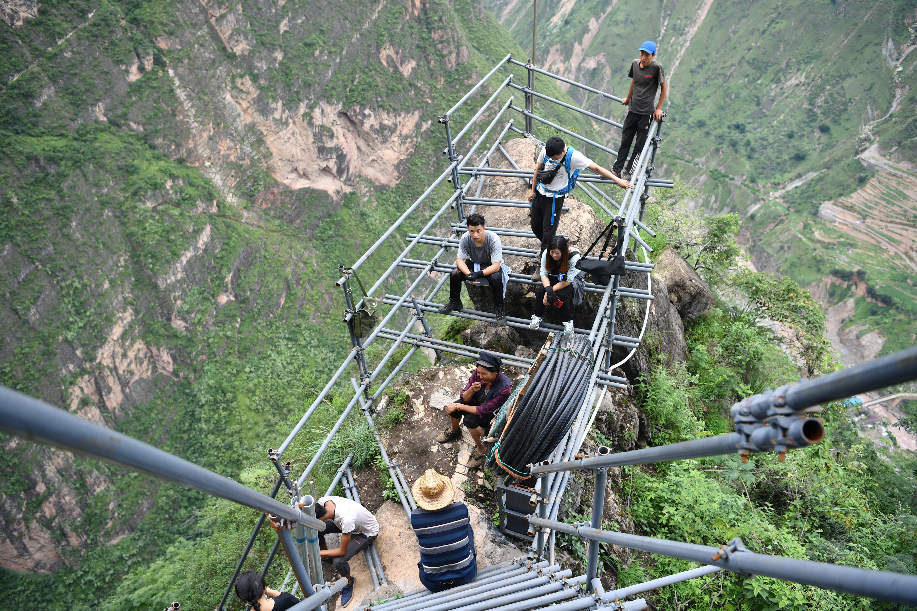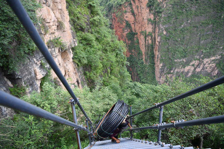 2017年9月初,四川涼山“懸崖村”村民背貨物通過天梯上山。四川省涼山州昭覺縣支爾莫鄉(xiāng)阿土列爾村,坐落于海拔約1600米的山坳中,從山底到山頂村莊海拔高差近1000米,村民往返村子都需要借助懸崖峭壁間的天梯,從而被稱為“懸崖村”。為緩解村民出行險的問題,當?shù)赝度?20噸鋼材、共6000根鋼管修筑了2556級“鋼管天梯”,工程于2017年6月底徹底完工,如今,“鋼管天梯”已經取代了之前更危險的藤梯,成為村民通往外界唯一的道路。 張浪 攝