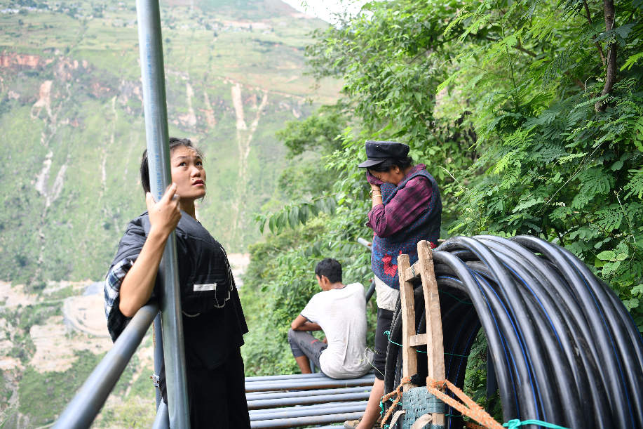 ????2017年9月初,四川涼山“懸崖村”村民背貨物通過天梯上山,中途休息。四川省涼山州昭覺縣支爾莫鄉(xiāng)阿土列爾村,坐落于海拔約1600米的山坳中,從山底到山頂村莊海拔高差近1000米,村民往返村子都需要借助懸崖峭壁間的天梯,從而被稱為“懸崖村”。為緩解村民出行險的問題,當?shù)赝度?20噸鋼材、共6000根鋼管修筑了2556級“鋼管天梯”,工程于2017年6月底徹底完工,如今,“鋼管天梯”已經取代了之前更危險的藤梯,成為村民通往外界唯一的道路。 張浪 攝