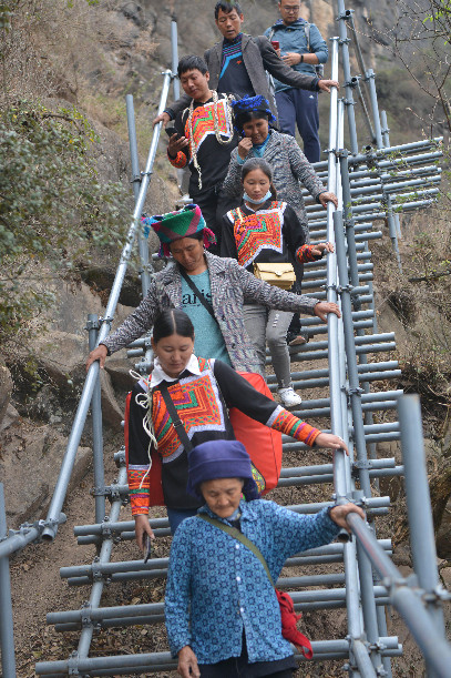 ????2020年5月13日,四川省涼山州昭覺縣支爾莫鄉(xiāng)阿土列爾村31戶村民帶著行李通過鋼梯下山,集中搬遷至昭覺縣易地扶貧搬遷縣城集中安置點的新家。阿土列爾村因位于垂直落差上千米的陡峭懸崖上,曾經村民上下山都要在巖壁上攀爬,從而被稱為“懸崖村”。5月14日前,全村84戶建檔立卡貧困戶將陸續(xù)搬進縣城新家。張浪 攝