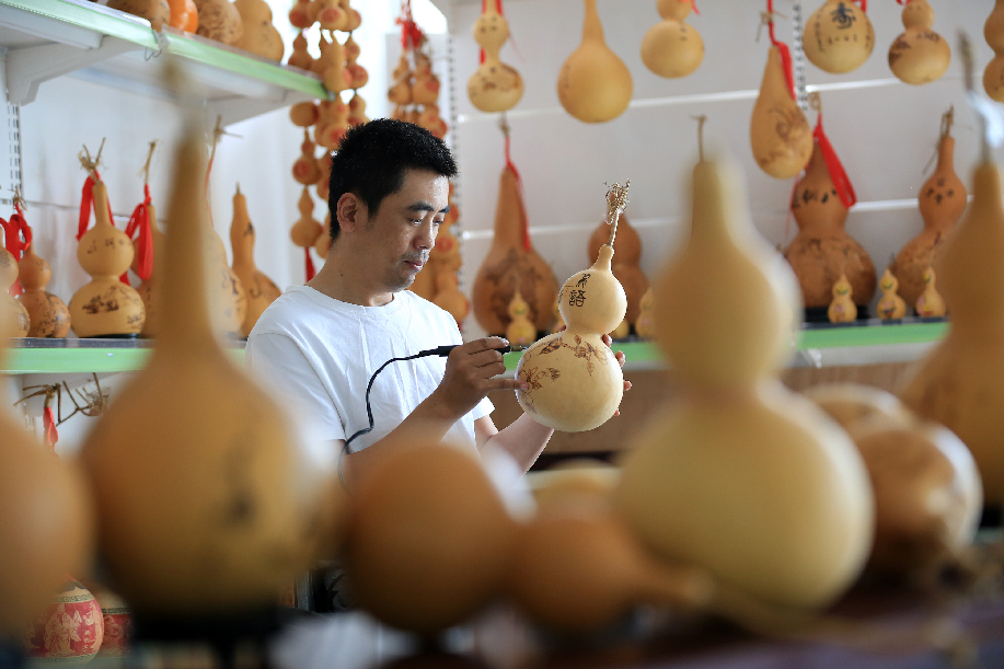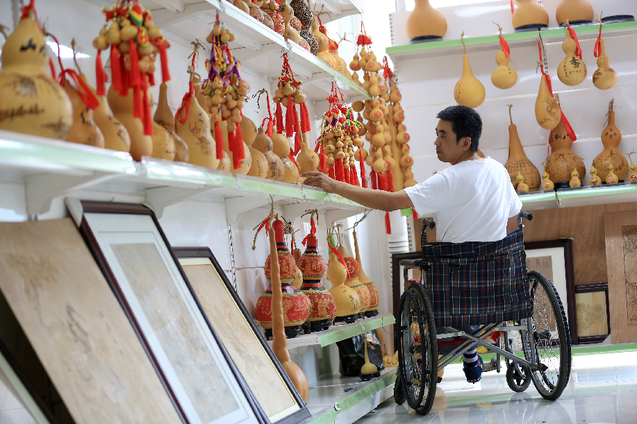 ????河北省邢臺市平鄉縣霍建龍,2014年因一起意外事故導致高位截癱。身殘志堅的他學習烙畫葫蘆藝術,實現脫貧致富,并創辦了殘疾人烙畫葫蘆社,帶領其他殘疾貧困群眾脫貧致富。圖為霍建龍整理葫蘆作品。 柴更利 攝