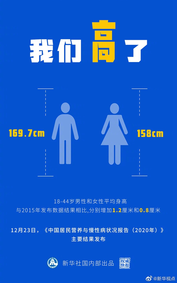 你的營養和健康情況怎樣?高了?身體倍棒?12月23日,一份關乎你我的健康大數據重磅上新,《中國居民營養與慢性病狀況報告(2020年)》主要結果發布——成人平均身高繼續增長,營養不足問題得到改善,健康意識逐步增強。(記者:陳聰,海報設計:張晨光) ????