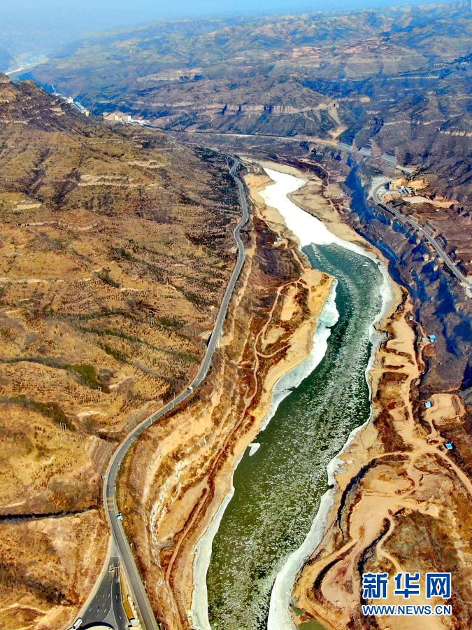 壺口瀑布至龍門水文站之間的黃河(12月26日攝,無人機(jī)照片)。新華社記者 劉詩(shī)平 攝