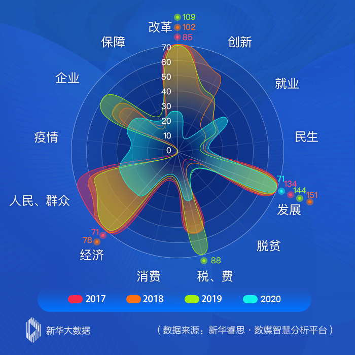 政府工作報告出爐,字斟句酌有多用心?新華睿思對2017年至2020年四年的政府工作報告進行了文本語義分析。四年來,政府工作報告圍繞“發展”“改革”“經濟”進行了全面的闡述和工作部署,回應群眾關切,堅持把人民群眾的利益放在第一位。