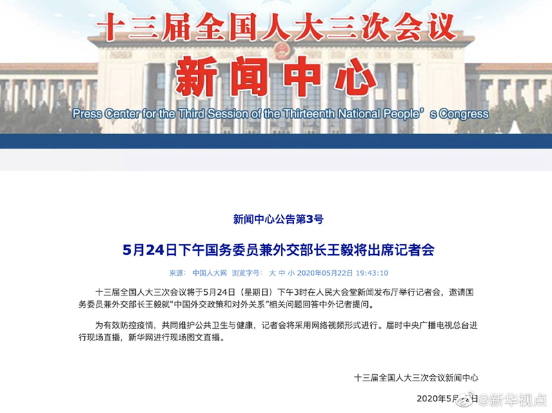 十三屆全國人大三次會議將于5月24日(星期日)下午3時在人民大會堂新聞發布廳舉行記者會,邀請國務委員兼外交部長王毅就“中國外交政策和對外關系”相關問題回答中外記者提問。