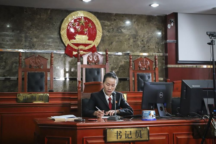 李金蓮在迪慶州中級人民法院法庭上準備開庭工作(5月7日攝)。新華社發(肖竹尹攝)