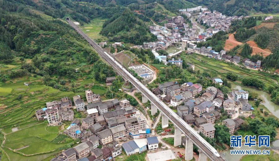 2020年10月4日,一列動(dòng)車行經(jīng)貴廣高鐵三江侗族自治縣同樂苗族鄉(xiāng)同樂村路段(無(wú)人機(jī)照片)。