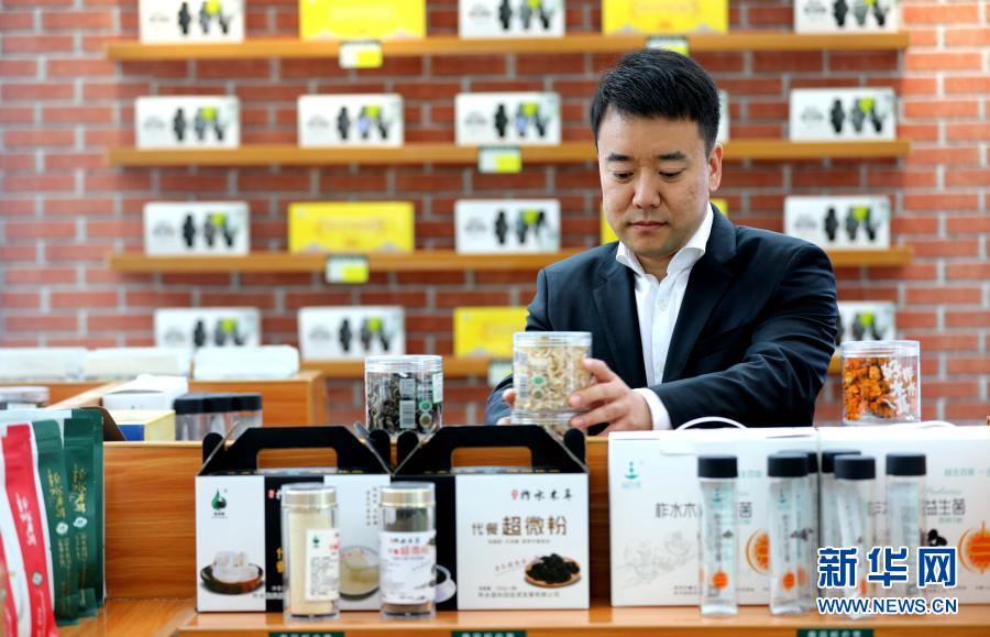 2020年4月21日,秦嶺天下電子商務有限公司總經理趙少康在金米村培訓中心整理貨架。新華社記者 梁愛平 攝