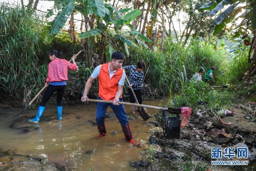 2020年5月2日,廣西興業(yè)縣小平山鎮(zhèn)金華村駐村第一書(shū)記董積有(左二)與村民一起清理河道中的淤泥和垃圾。新華社記者 曹祎銘 攝