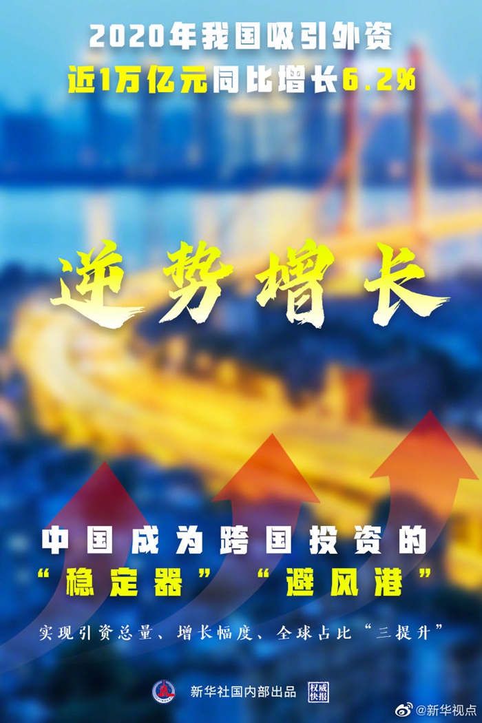 新冠肺炎疫情沖擊下,全球跨國投資大幅下降,中國引資卻逆勢增長。商務部1月20日發布數據顯示,2020年我國非金融領域實際使用外資9999.8億元人民幣,同比增長6.2%,實現了引資總量、增長幅度、全球占比“三提升”。中國成為跨國投資的“穩定器”和“避風港”。(記者于佳欣)?