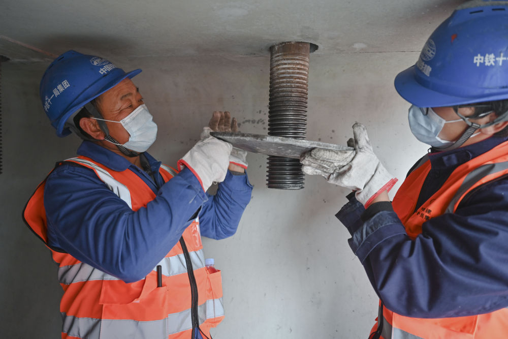 1月28日,杜學剛(左)和工友在擰緊提梁螺栓。