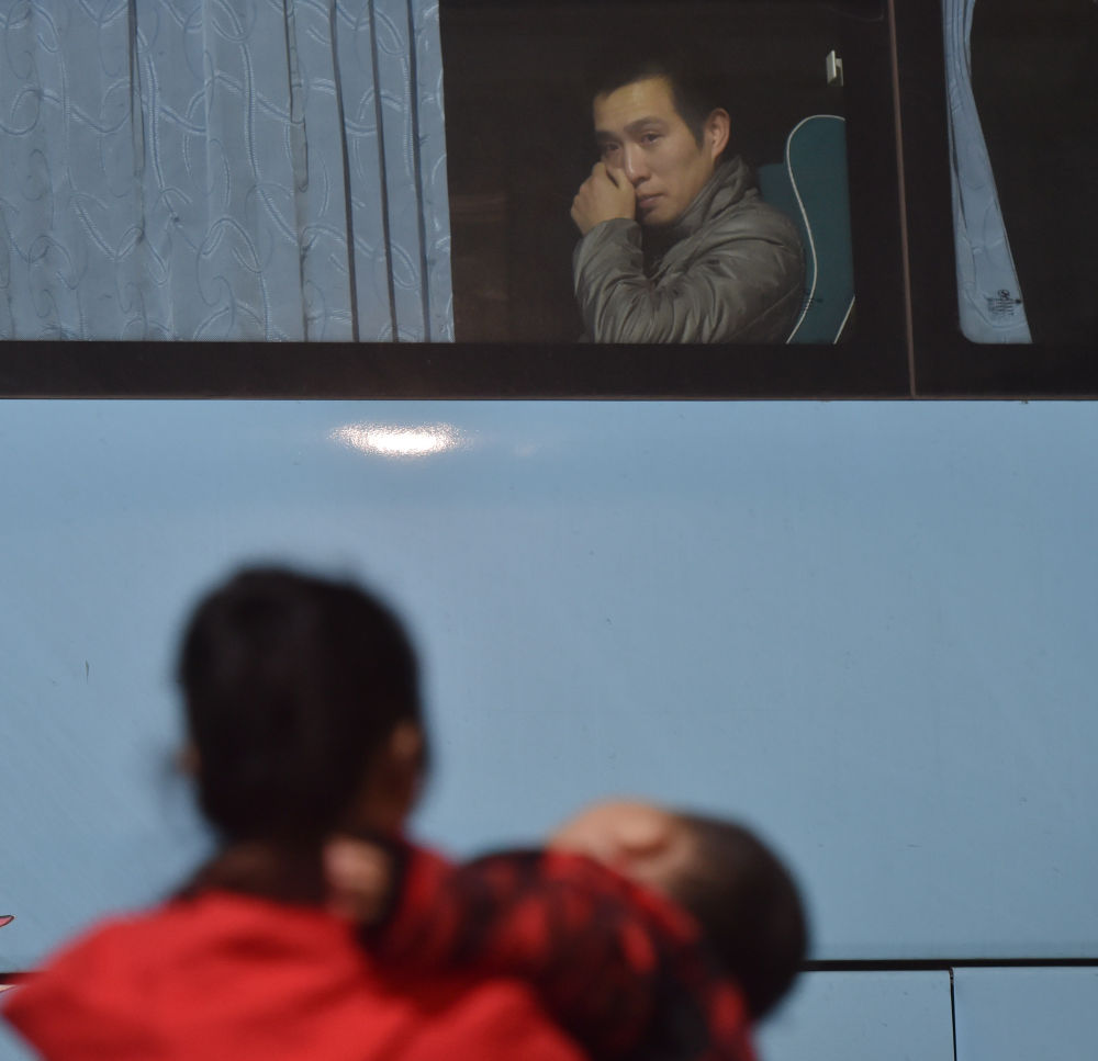 2018年2月2日凌晨,黃海龍登上回四川老家的長途車,看到聰聰哭鬧著不要爸爸走,用手擦著眼淚(資料照片)。