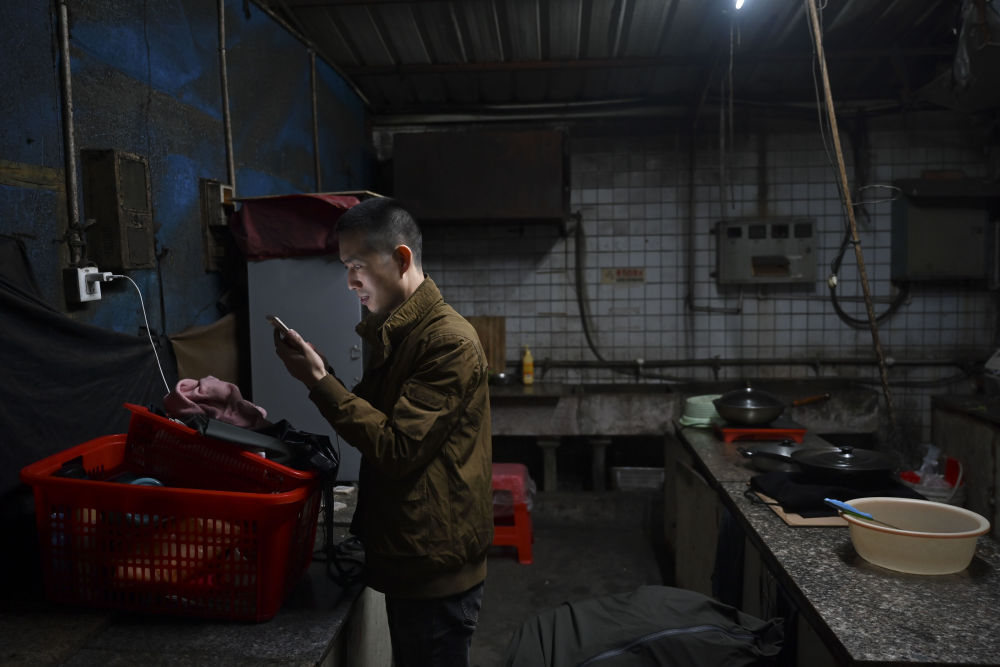 1月26日,黃海龍在廚房用手機查看剛剛收到的工資明細。這一年他們夫妻每天工作超過12小時,收入合計約16萬。