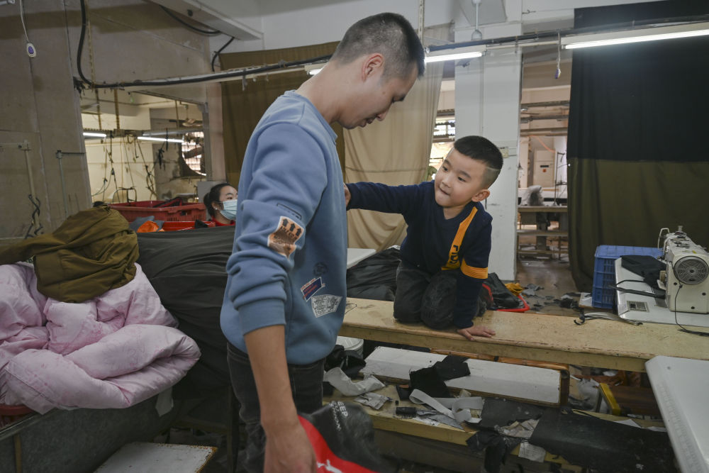 1月26日,在福建省石獅市的金利萊斯服裝廠,聰聰和黃海龍在一起。