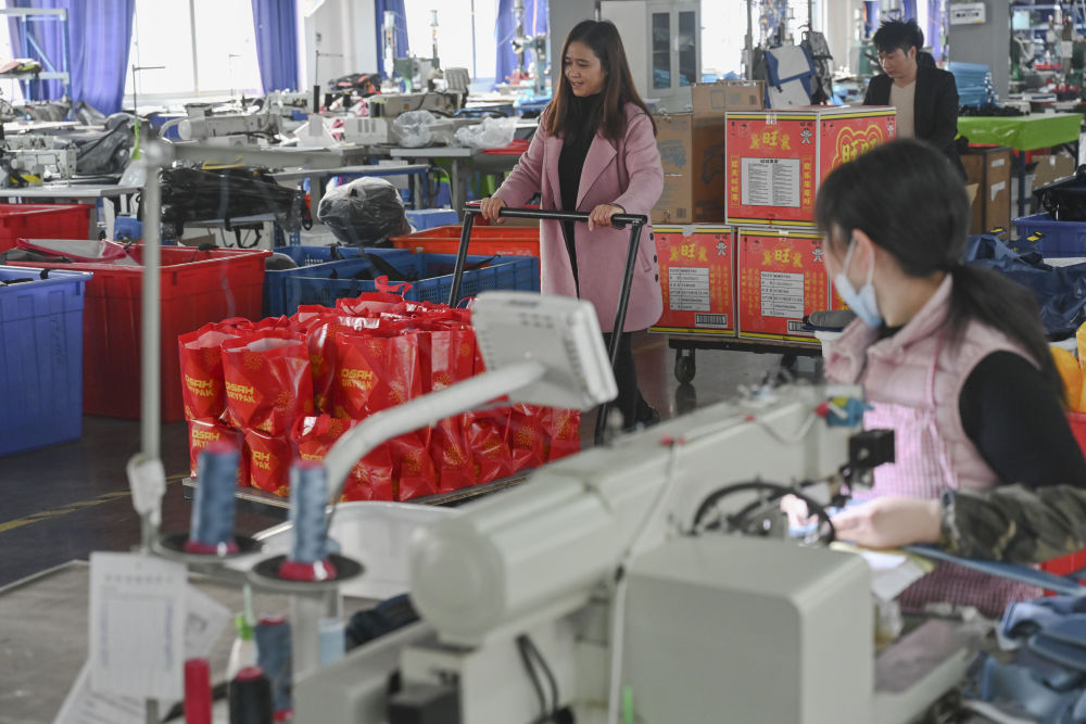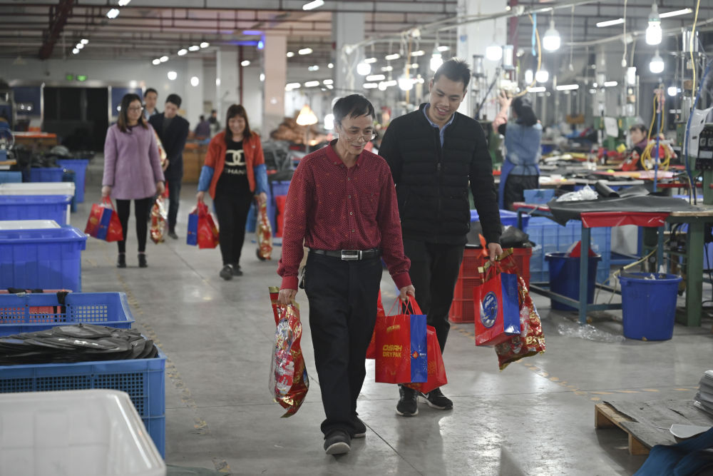 在福建省福州市閩侯縣一家戶外用品工廠,除了政府出臺的補貼政策之外,企業還為留下來的90多名工人發放了年貨大禮包,這些人中就包括張良國。
